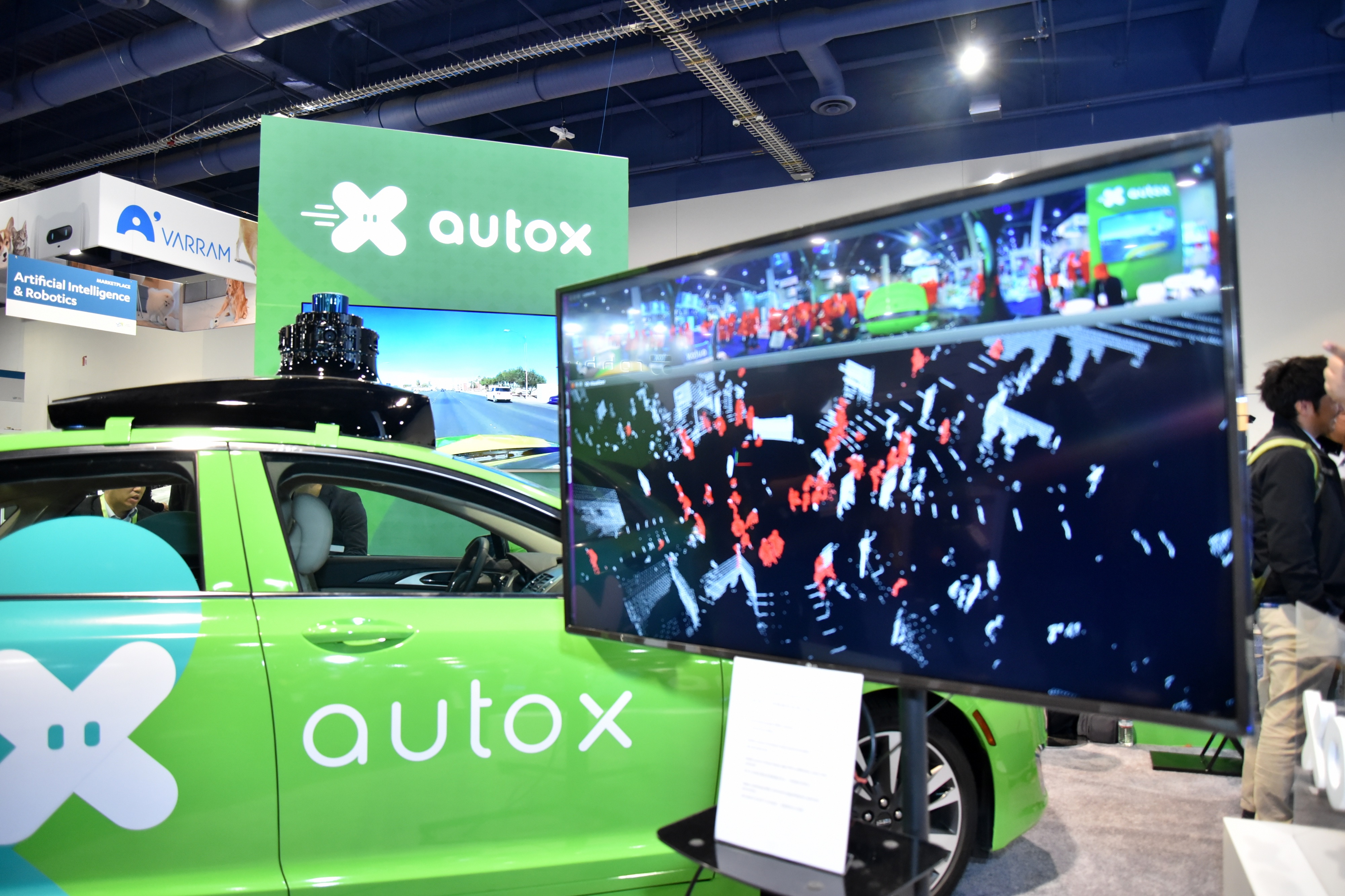 The secret sauce at work here is AutoX’s proprietary perception system, known as xFusion. We rely on multiple sensors, each of which carries its own unique advantages, such as the rich color information and high frame rates of cameras and the accurate distance measurements and detection capabilities of lidar and radar. xFusion syncs and combines the information from these sensors, enabling a remarkably precise object detection and recognition pipeline. We had this system on display at our booth, where the static sensors displayed their dynamic surroundings for everyone to see: